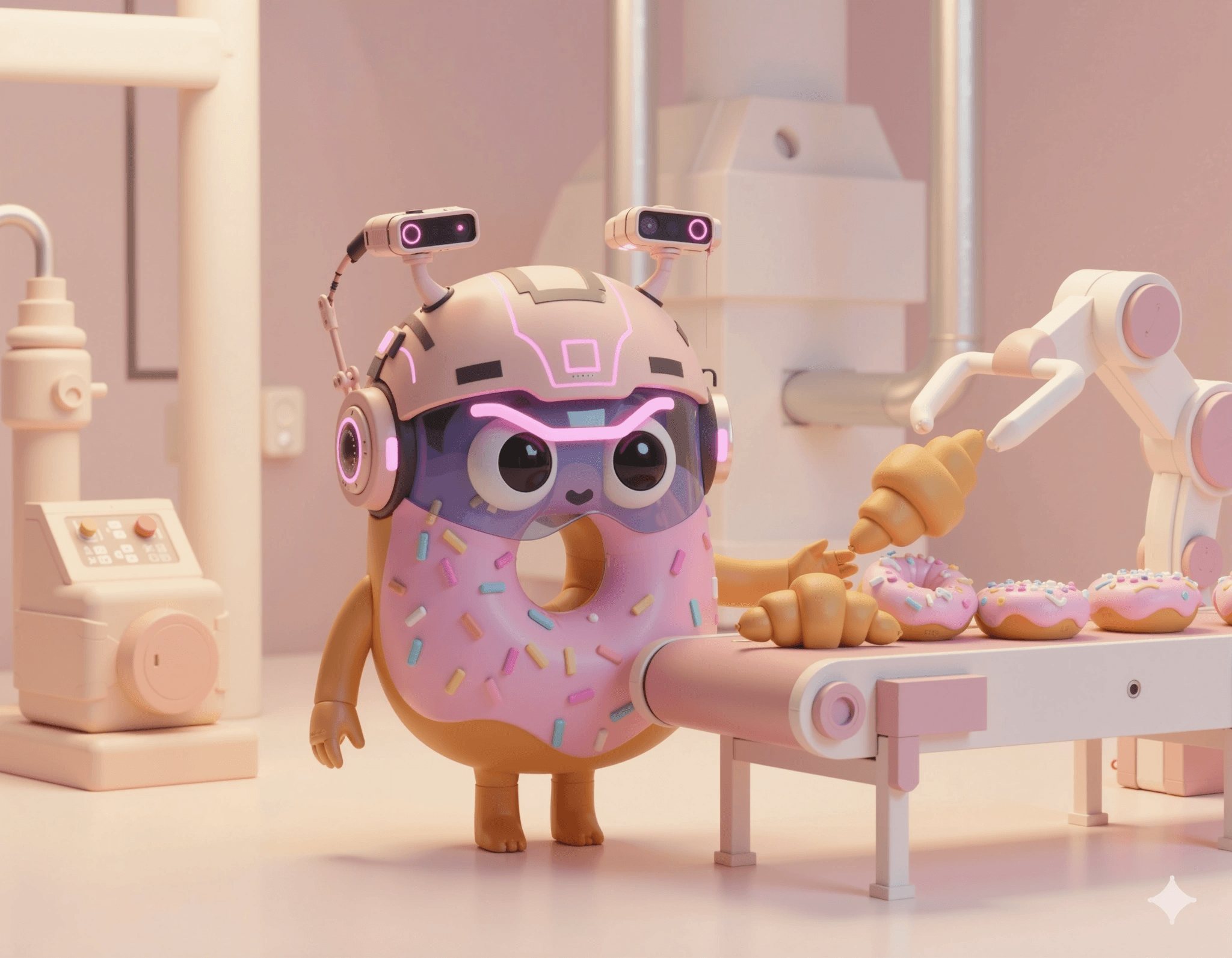 "Cute 3D character of a [YOUR OBJECT, e.g., PINK DONUT] with robotic headphones, standing on a minimalist tech platform, soft studio lighting, high-quality octane render, pastel colors, 4k, isolated on simple background."