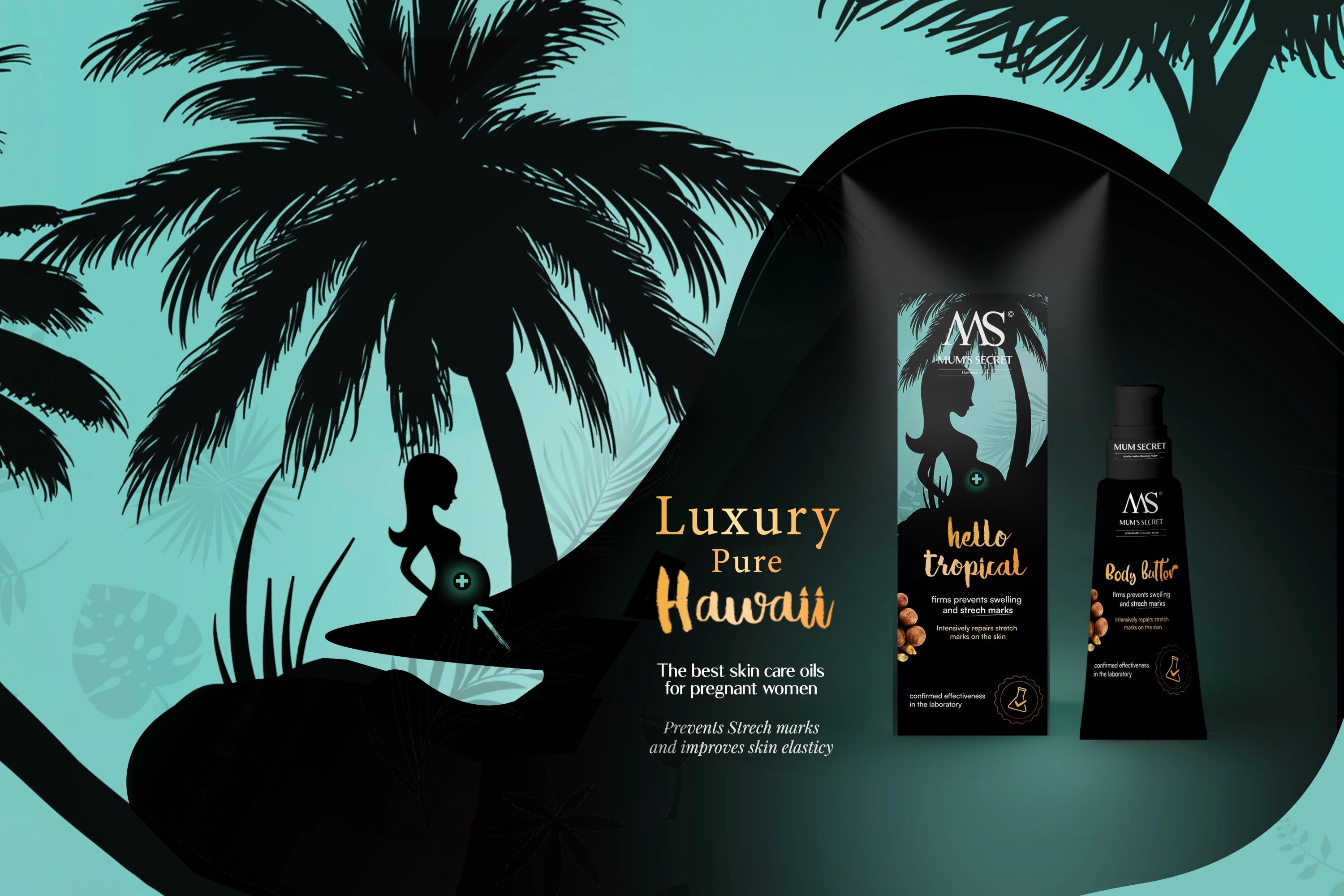 Visual Strategy: Integrating silhouettes of the pregnant form with tropical palm patterns to highlight the natural, exotic ingredients.